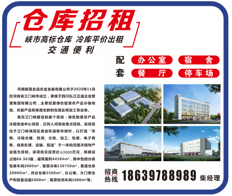 其在三門峽建設(shè)的首個(gè)項(xiàng)目:綠色智慧農(nóng)產(chǎn)品冷鏈物流中心項(xiàng)目,已列入河南省重點(diǎn)項(xiàng)目。該項(xiàng)目位于三門峽湖濱區(qū)崖底街道陳宋坡村,以打造“采購(gòu)、冷鏈倉(cāng)儲(chǔ)、檢測(cè)、分揀、加工、包裝、電子商務(wù)、信息處理、運(yùn)輸、配送”于一體的完整冷鏈物產(chǎn)業(yè)鏈為目標(biāo)。該項(xiàng)目總投資達(dá)63000萬(wàn)元,其建設(shè)占地66.363畝,建筑面積44584m2,其中包括分揀包裝車間2000m2,智慧冷庫(kù)136750m3,普通倉(cāng)庫(kù)20000m2,月臺(tái)倉(cāng)庫(kù)3500m2,辦公樓、大門等生產(chǎn)和配套設(shè)施5000m2,蔬菜檢測(cè)車間1000m2等。招商熱線: 柴經(jīng)理18639788989