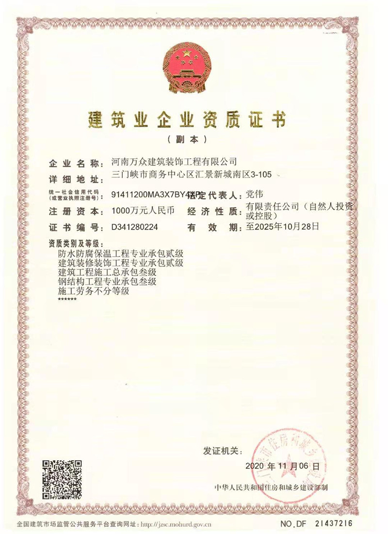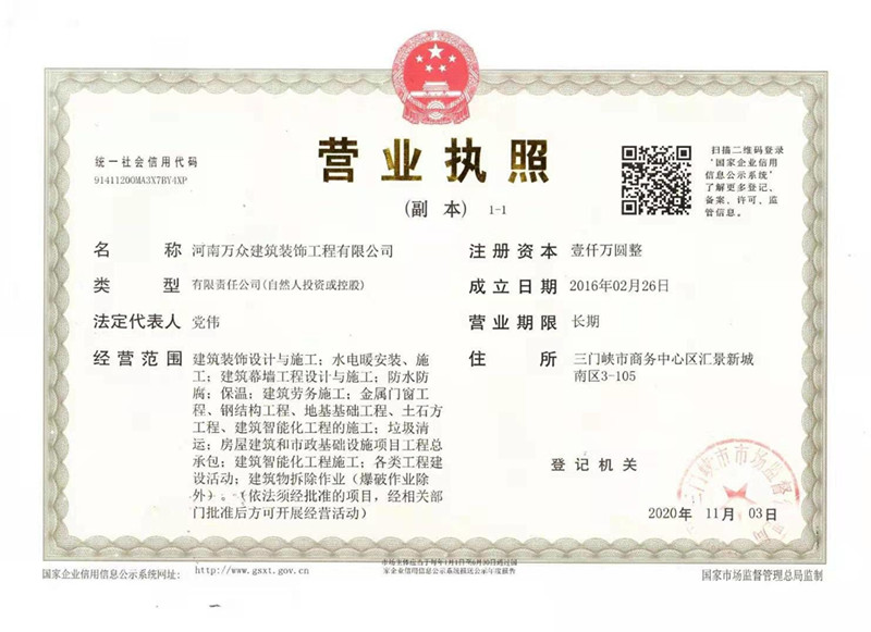 產(chǎn)品簡(jiǎn)述:河南萬眾建筑裝飾工程有限公司位于美麗的天鵝之城——三門峽市,是一家專門從事建筑工程及裝飾、裝修、設(shè)計(jì)與施工。公用建筑室內(nèi)外裝飾、裝修設(shè)計(jì)與施工、環(huán)境設(shè)計(jì)與施工、企業(yè)VI設(shè)計(jì)、售后服務(wù)為一體的裝飾公司。